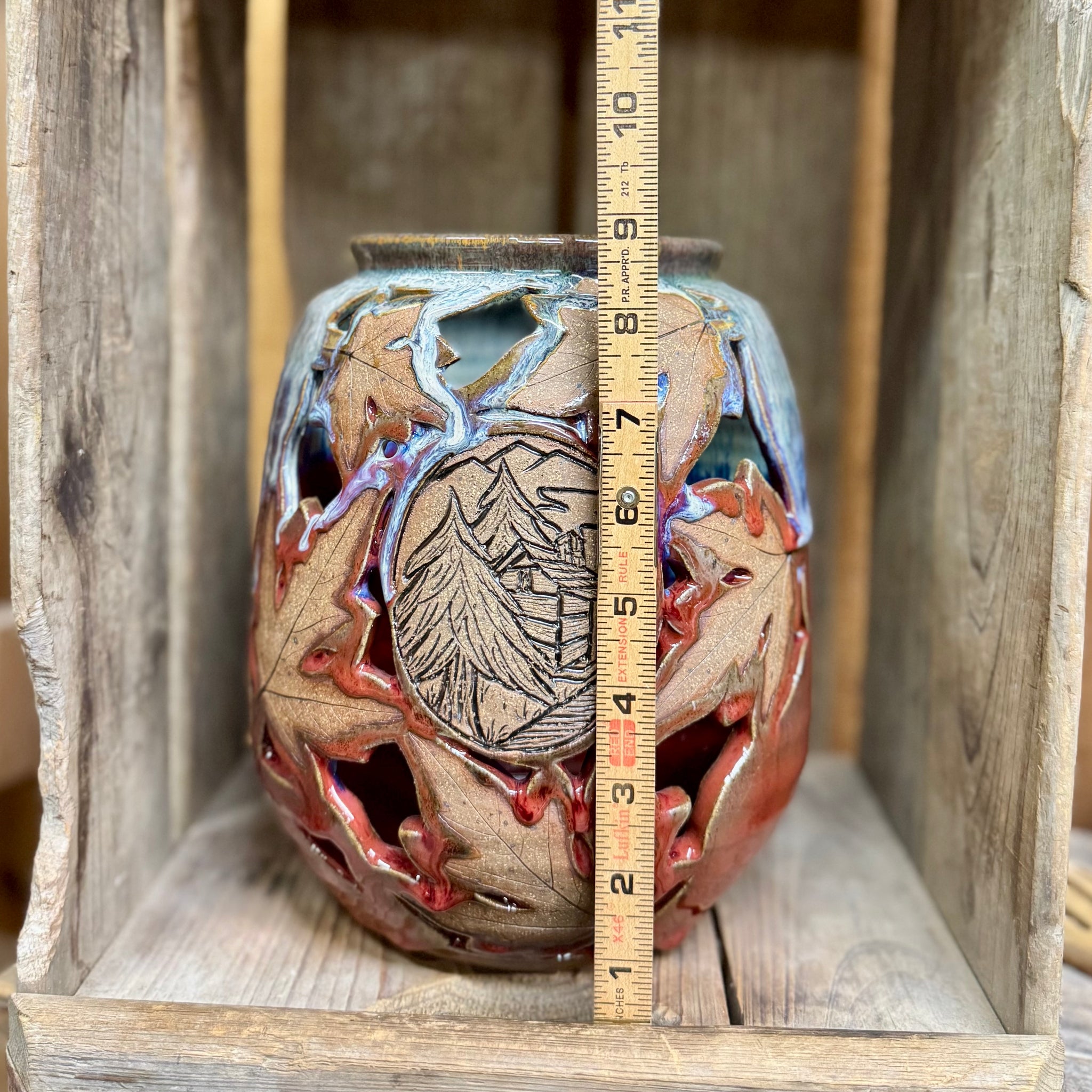 Hand carved cabin with real leaf impressions and safe for a candle. Our red glaze has “crazing” which appear as tiny “cracks” in the glaze. This is just an effect of the glaze and not actual cracks.