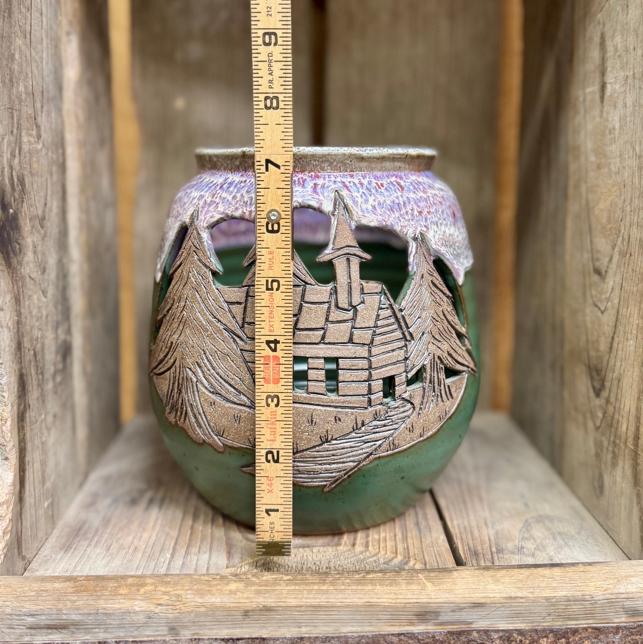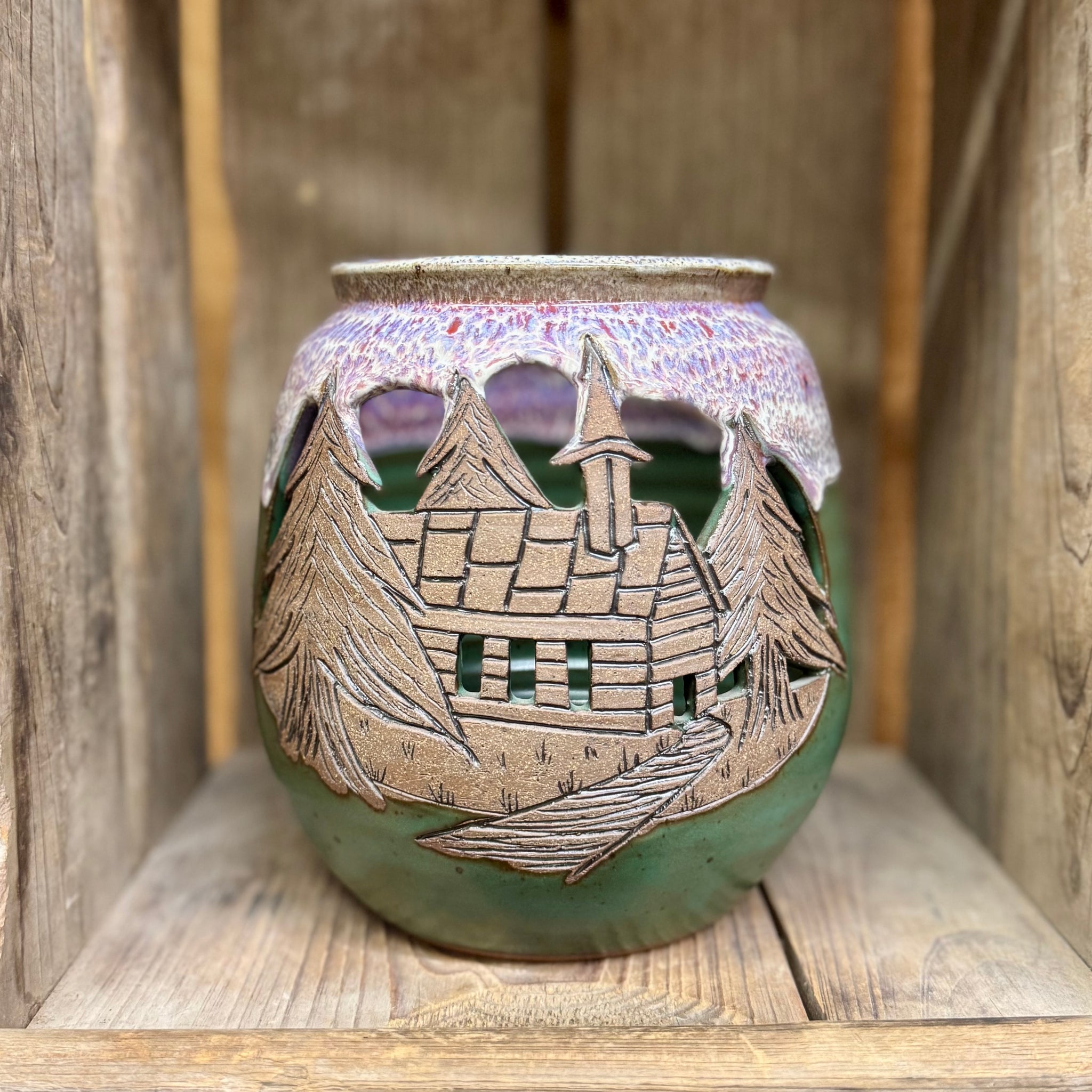 Hand carved church scene on this luminary. Safe for a candle.