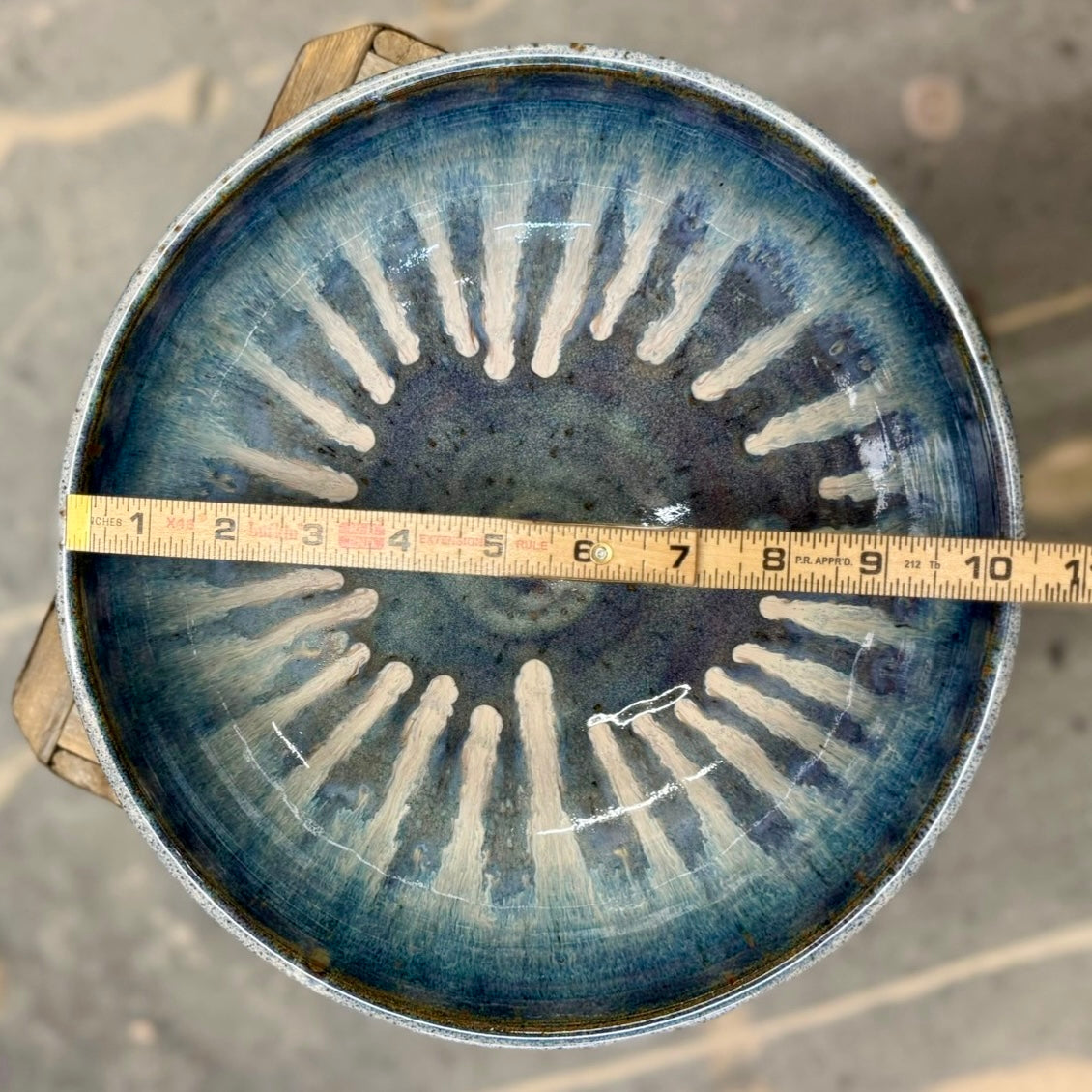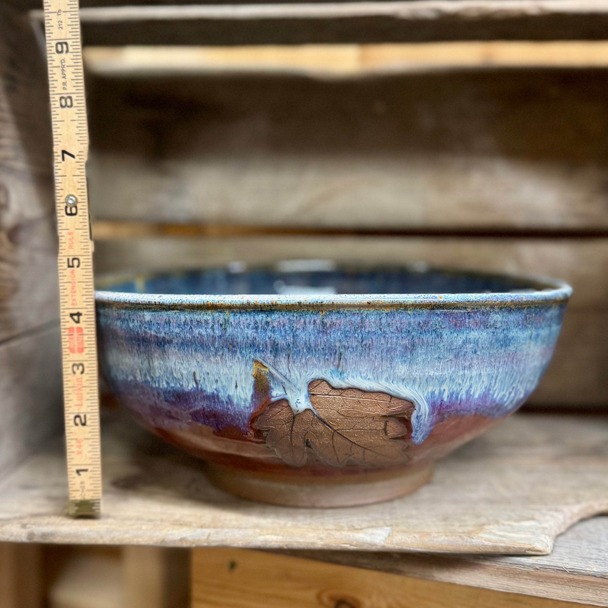 Large serving bowl with real leaf impressions. Our red glaze has “crazing” which appear as tiny “cracks” in the glaze. This is just an effect of the glaze and not actual cracks.