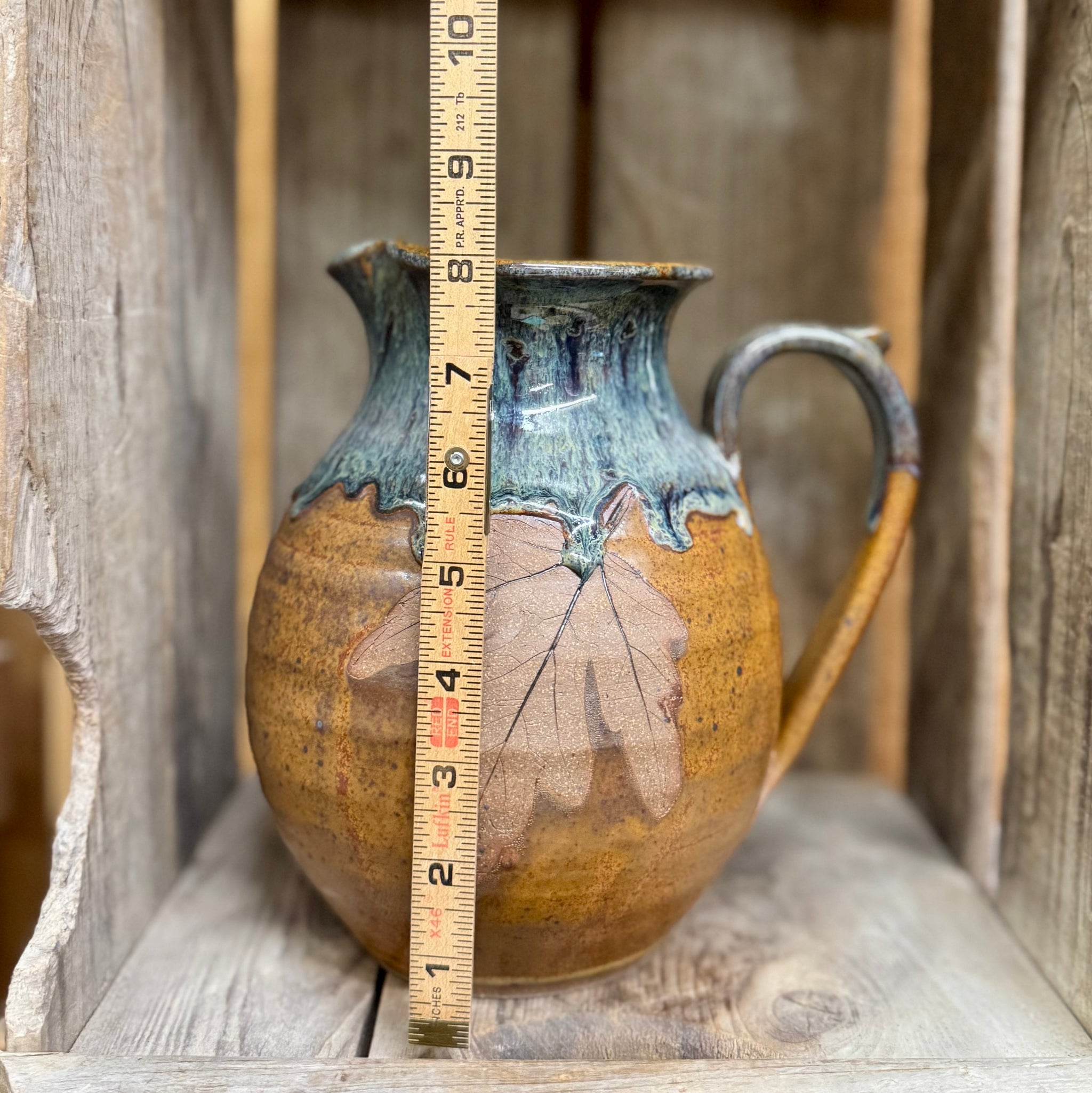 Pitcher holding approximately 2 quarts with leaf impressions on both sides.