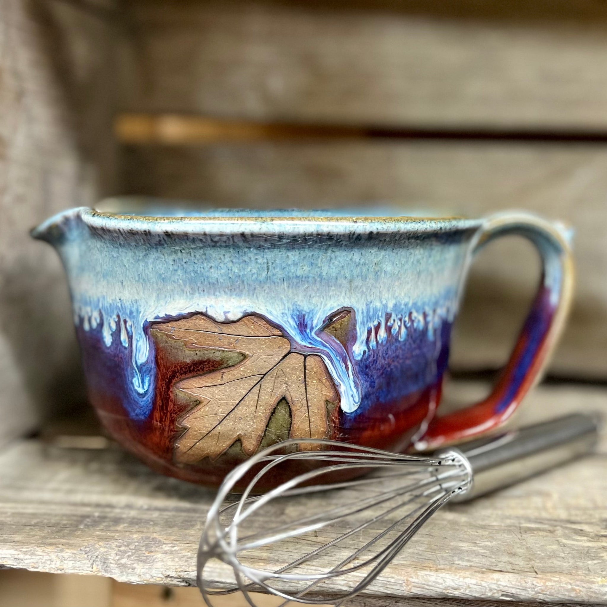 Has a leaf imprint on both sides, hand-applied using leaves from the Smokies. Microwave and dishwasher safe and holds approximately 4 cups. Whisk included.