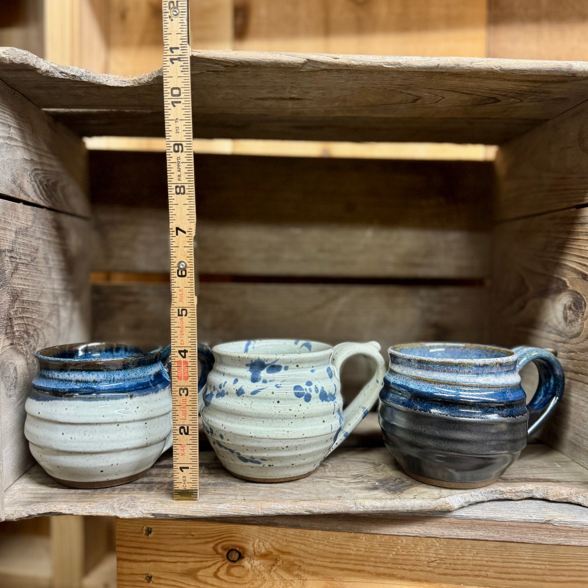 Set of 3 mugs, each holding approximately 12 ounces. Microwave and dishwasher safe.