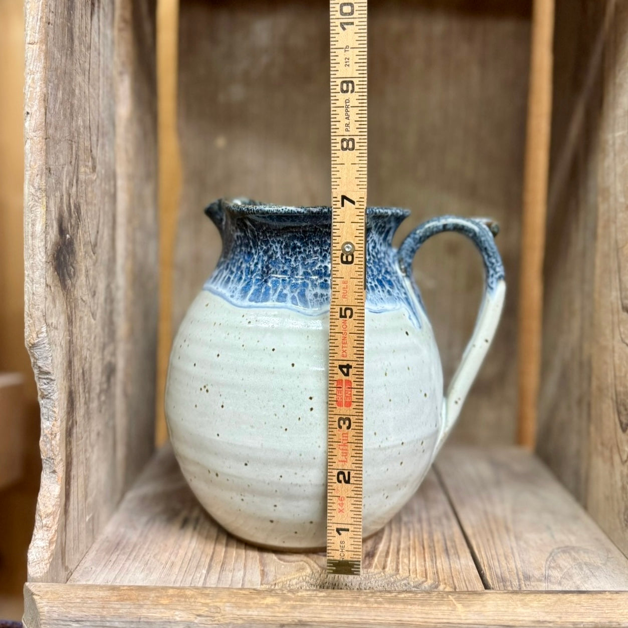 2 quart pitcher. Every pot is handmade and unique. No two are exactly alike and they each have their own character. The image you see is a very close representation of the item you are ordering with slight variations
