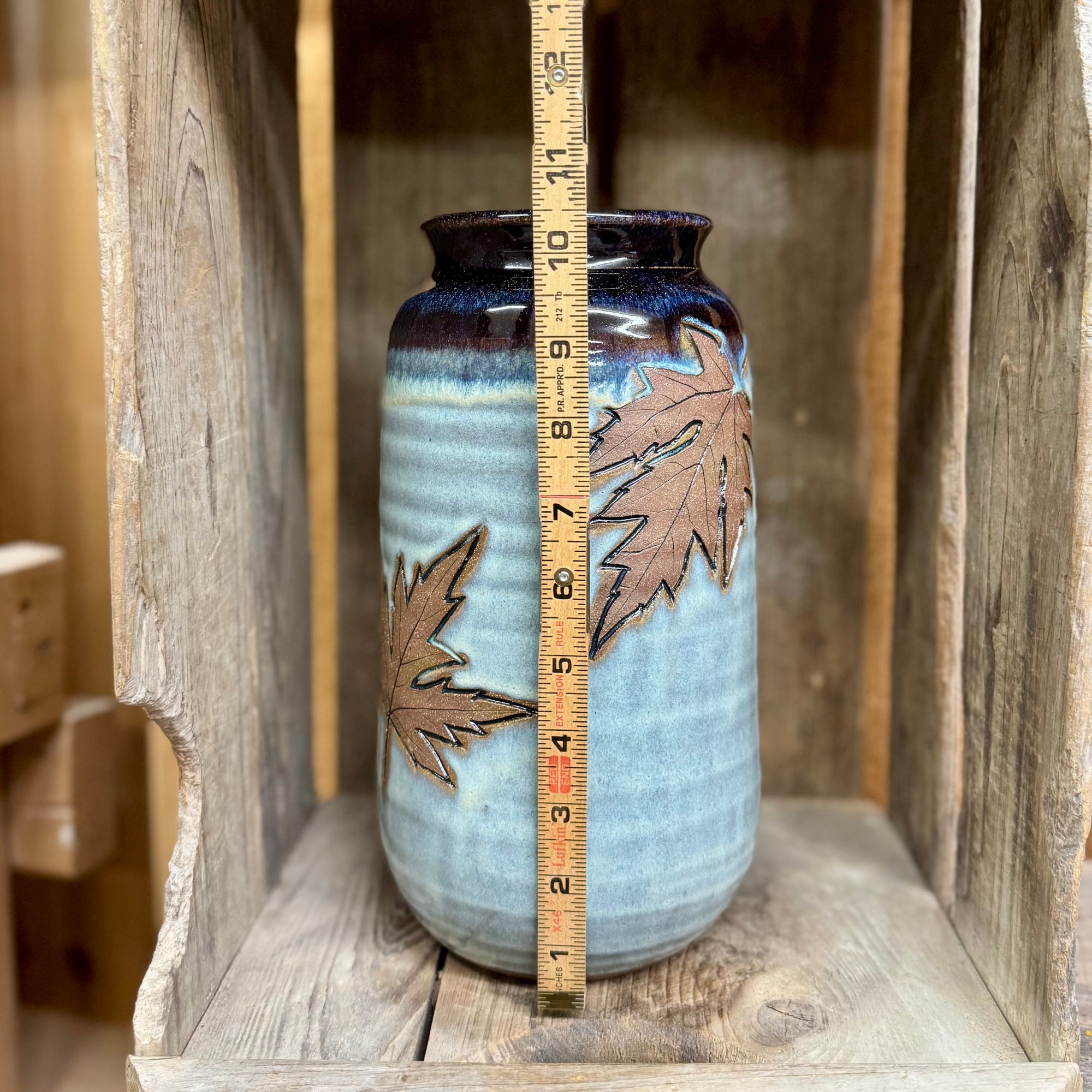 Real leaf impressions rolled into the clay and outlined to make them “POP” on this tall vase.