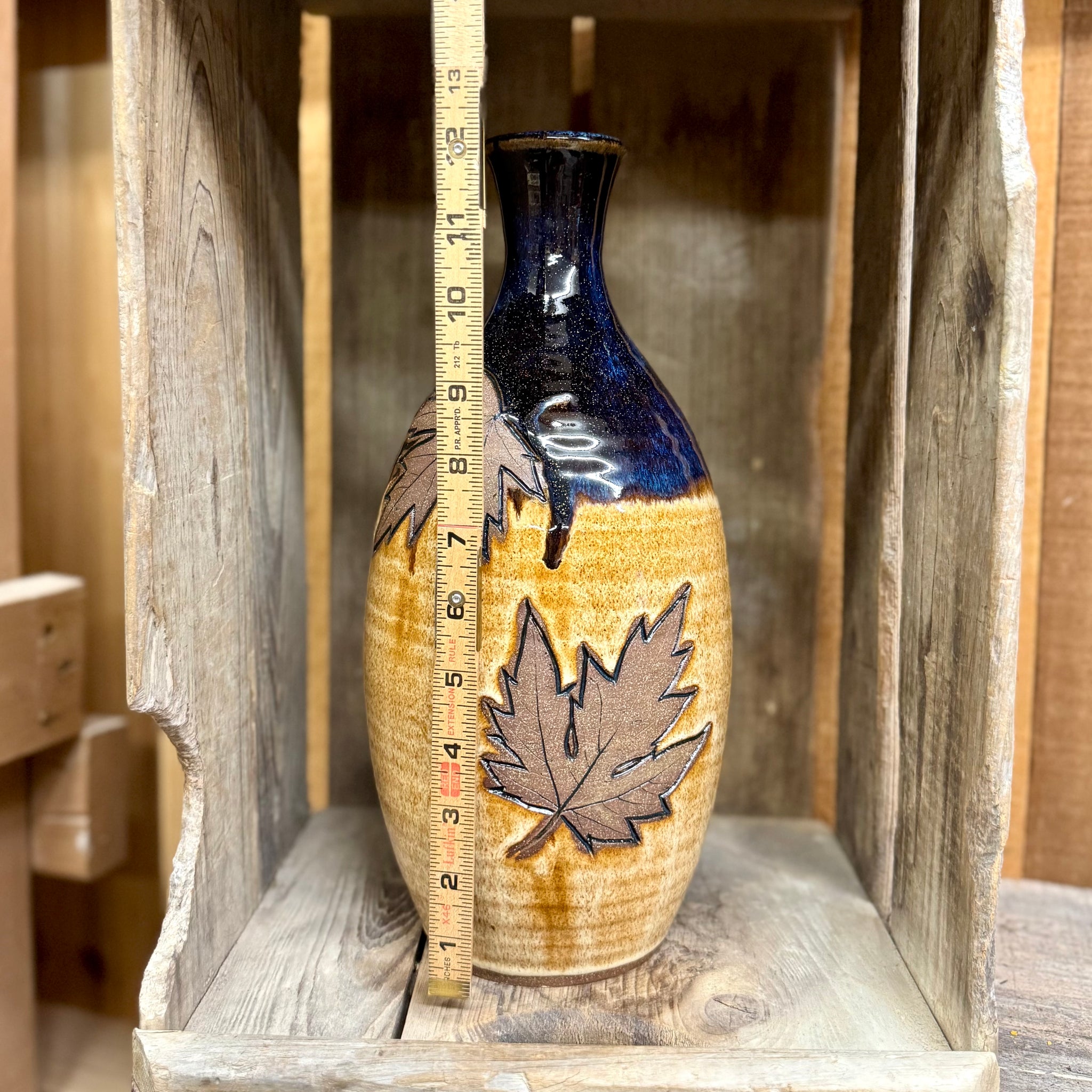 Real leaf impressions rolled into the clay and outlined to make them “POP” on this tall vase.