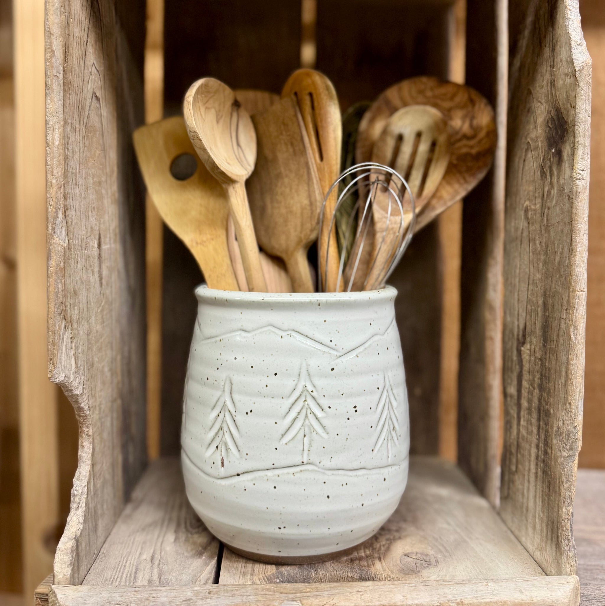 Perfect for your kitchen tools. Every pot is handmade and unique. No two are exactly alike and they each have their own character. The image you see is a very close representation of the item you are ordering with slight variations. Dishwasher safe.