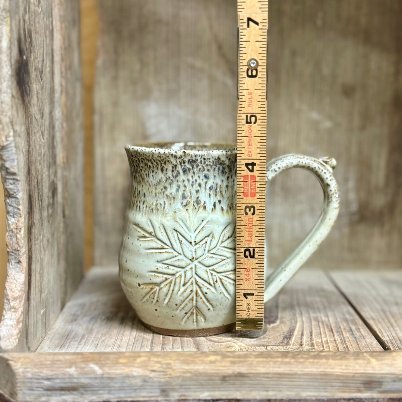 The much anticipated snowflake mug! Holds approximately 14 ounces and is microwave and dishwasher safe.