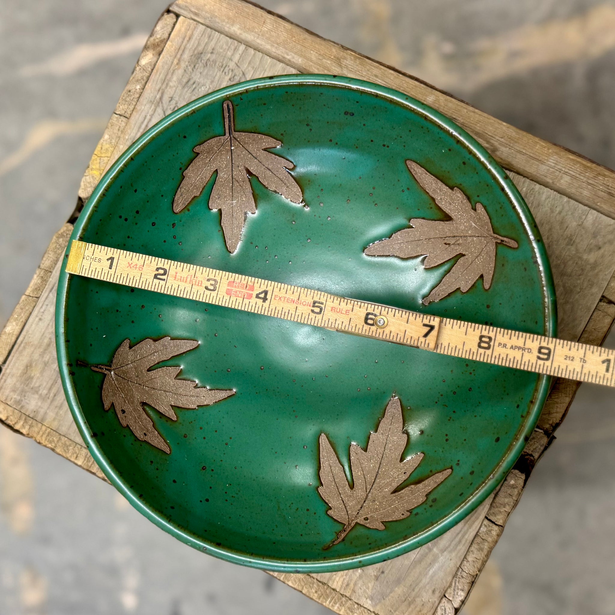 Shallow, decorative bowl with real leaf impressions.