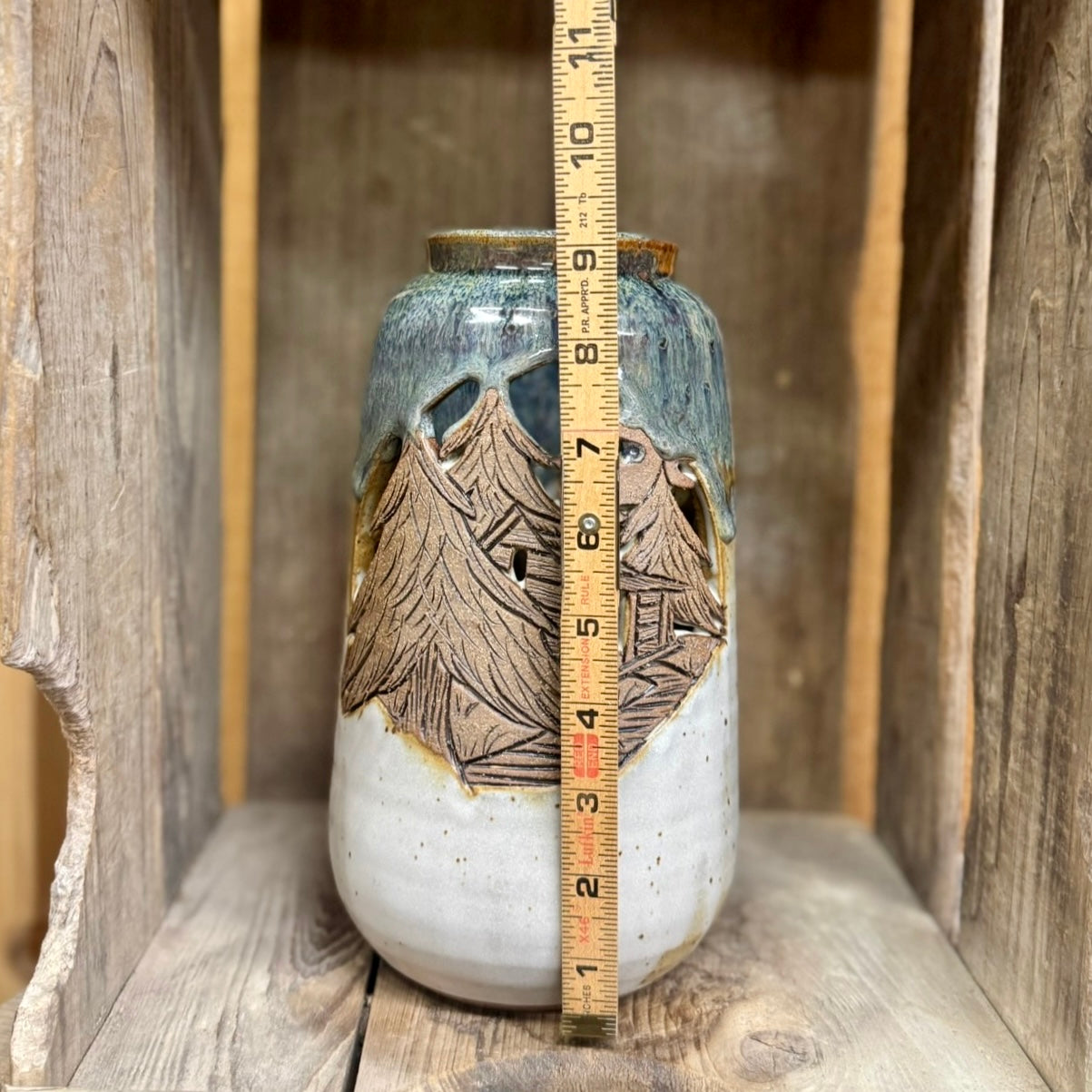 Tall luminary with hand carved cabin design.