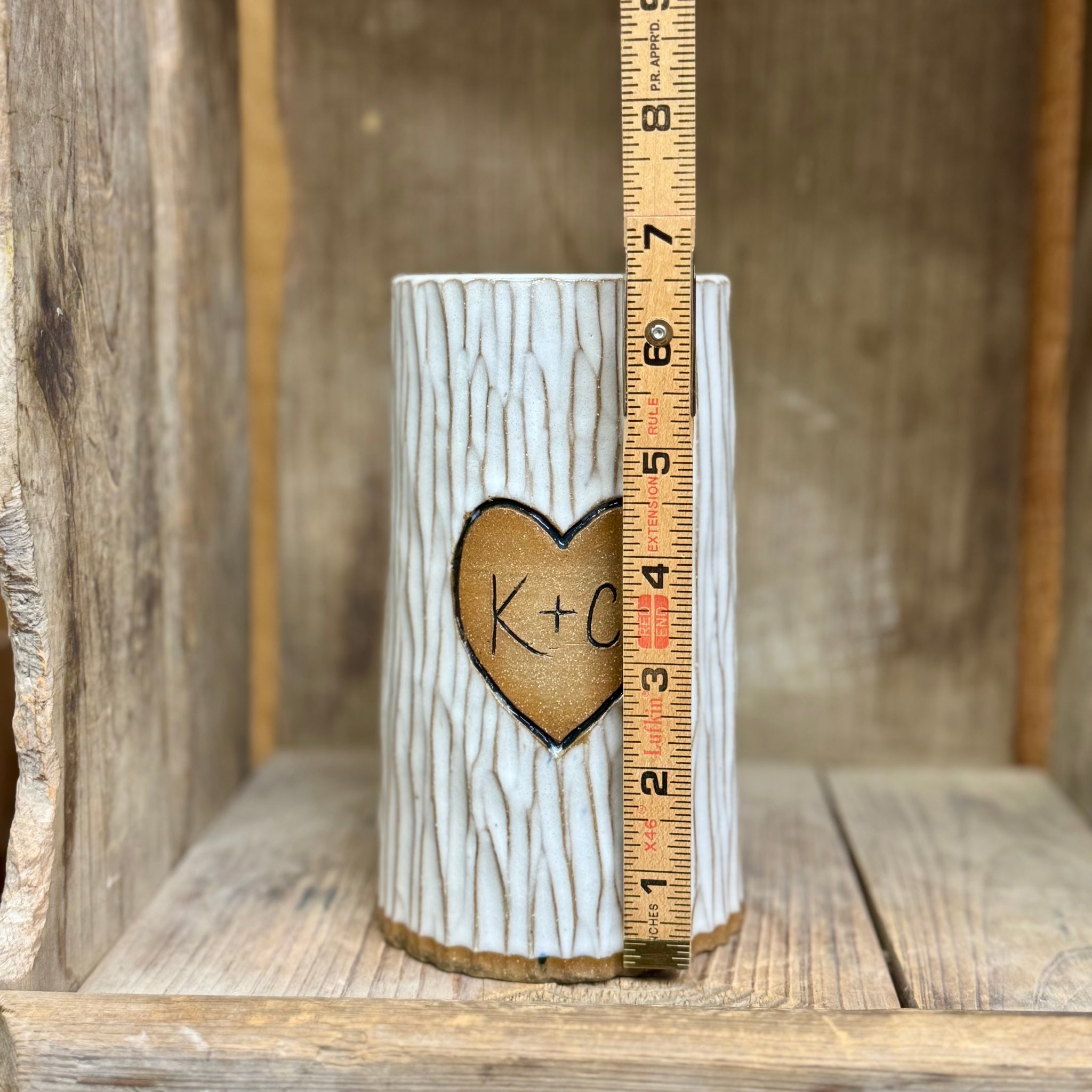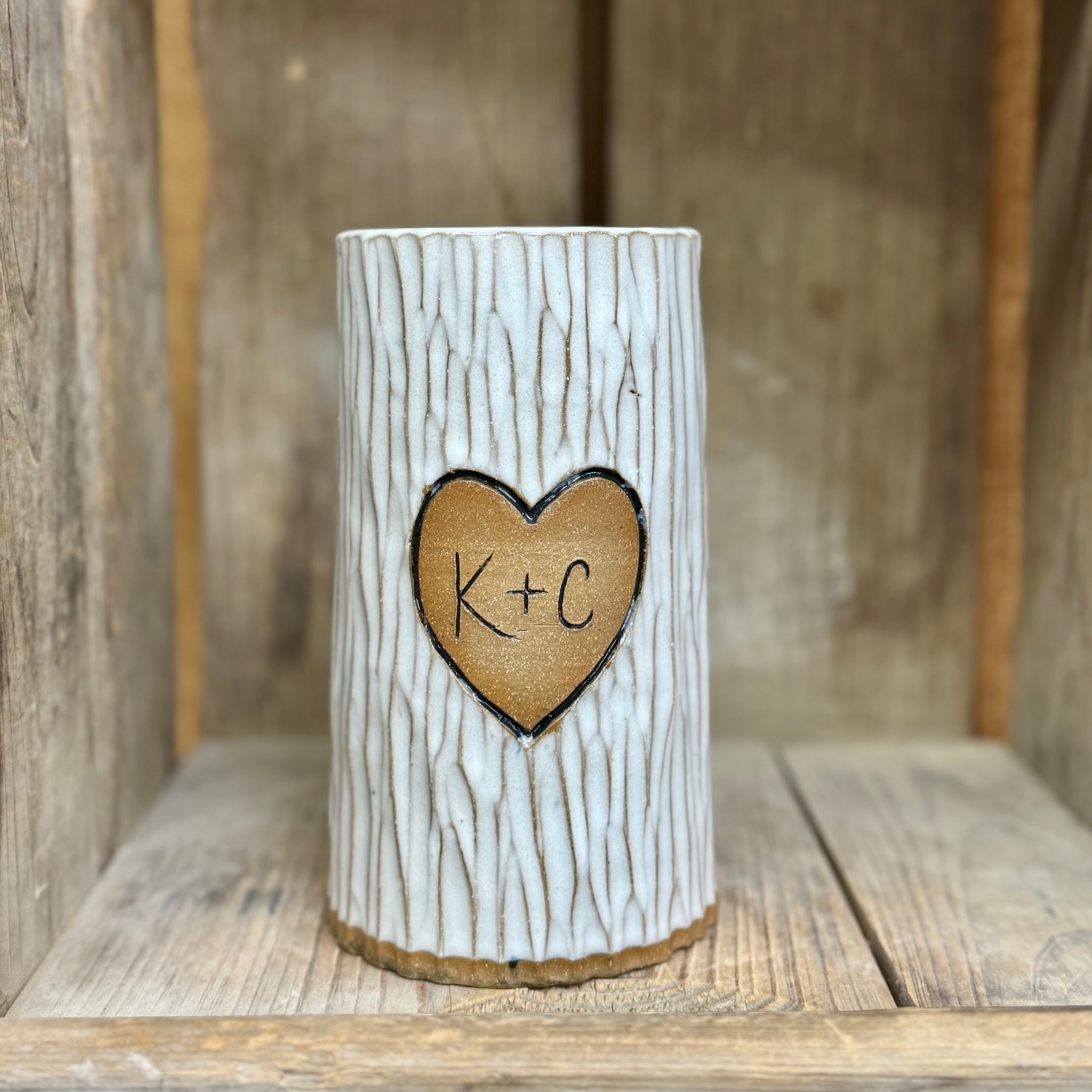 For a limited time we are offering this custom vase in our tree carving style with your initials! Just add the 2 initials to the note when you place your order. These are made to order so please allow 4 weeks for delivery.