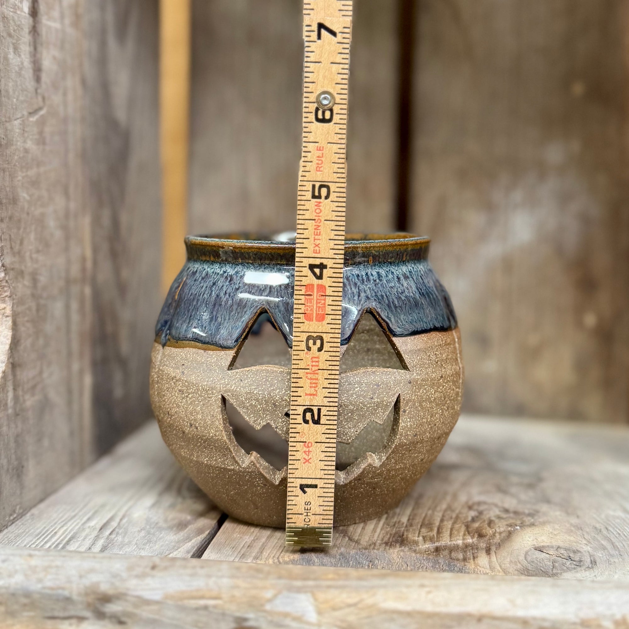 Seasonal luminary in whimsical Jack O’Lantern design. Safe for a candle.