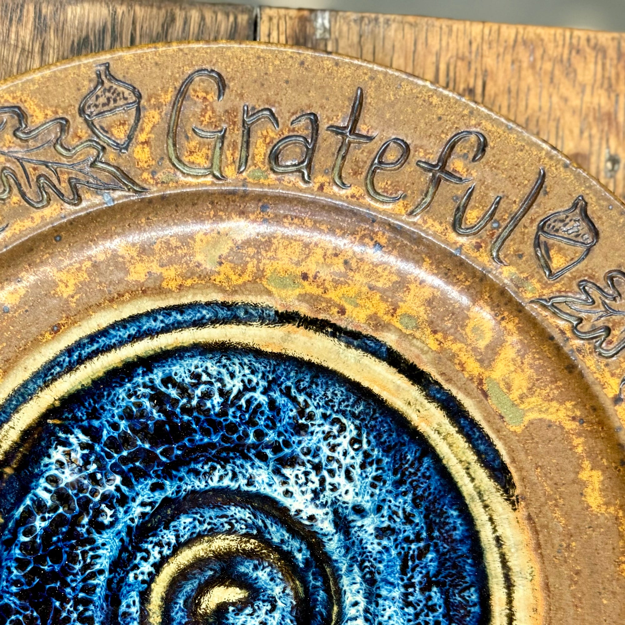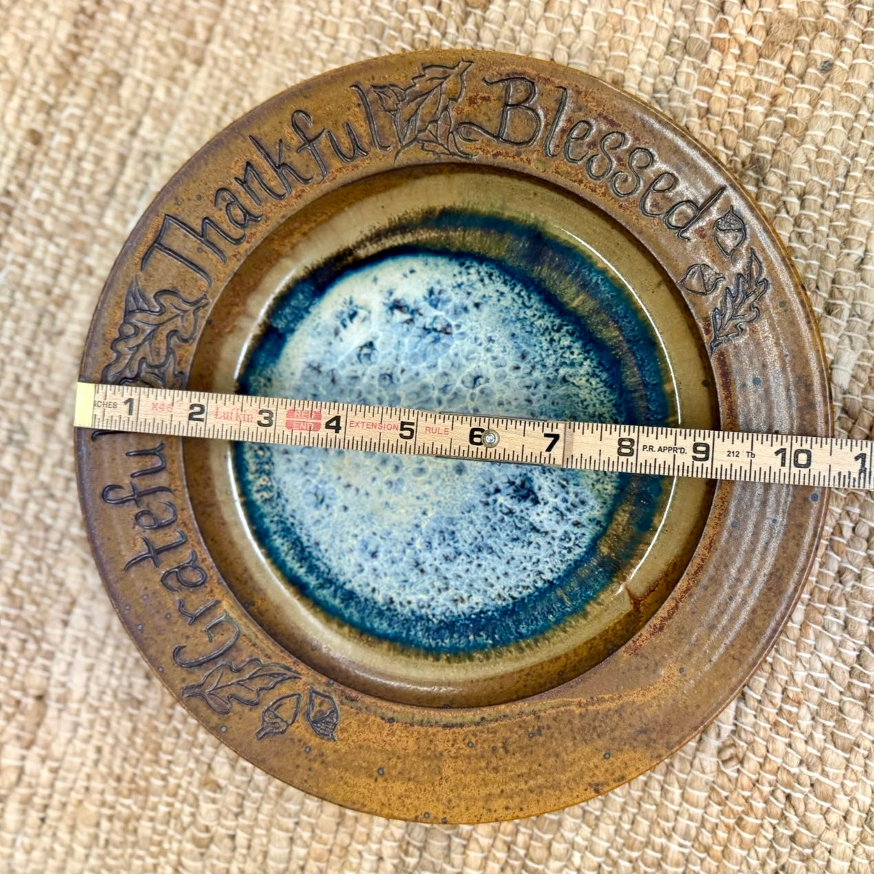 Plate with hand carved “Thankful Grateful Blessed” decoration.