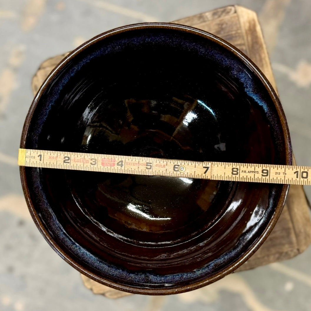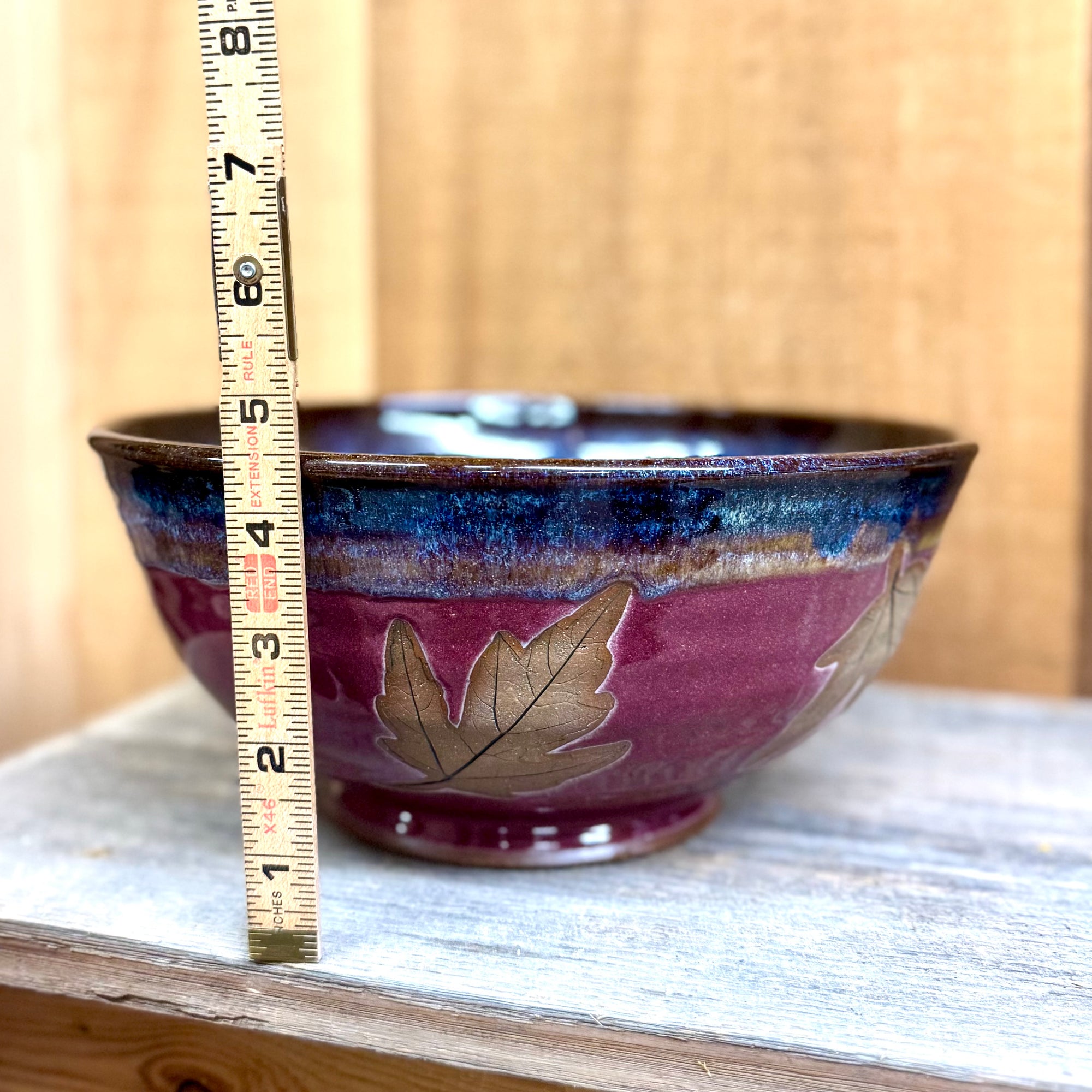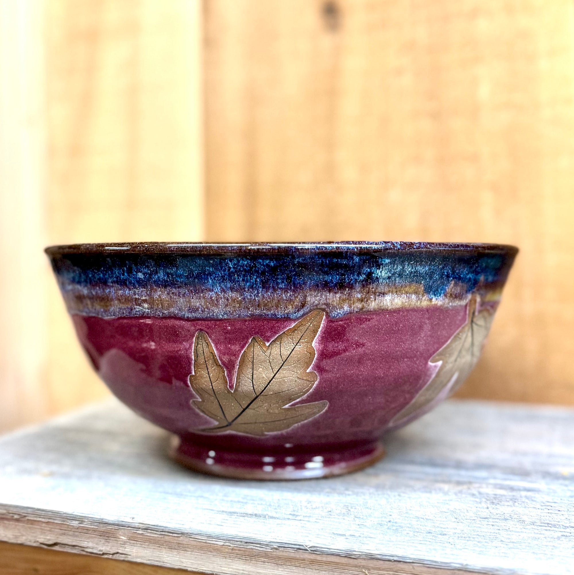 Large serving bowl with leaf impressions, glazed in our signature mountain glaze.