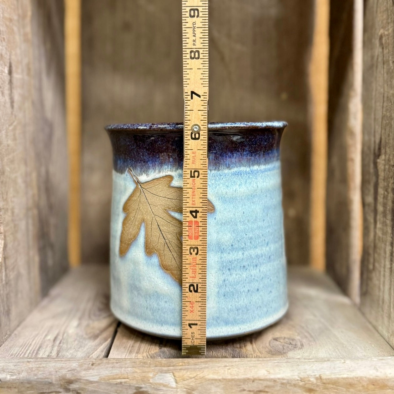 Decorative Maple Leaf on each side. Every pot is handmade and unique. No two are exactly alike and they each have their own character. The image you see is a very close representation of the item you are ordering with slight variations.