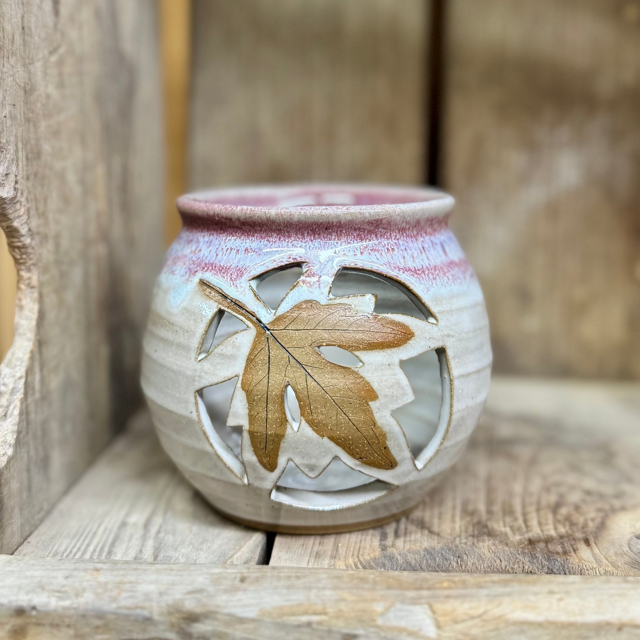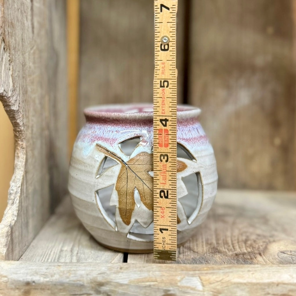 Hand carved luminary with a real leaf impression. Safe for a candle.