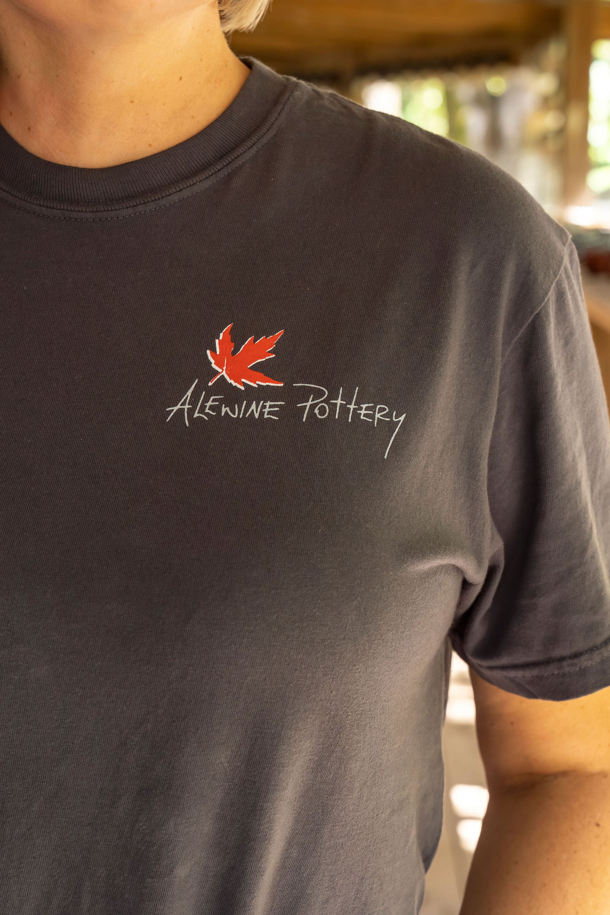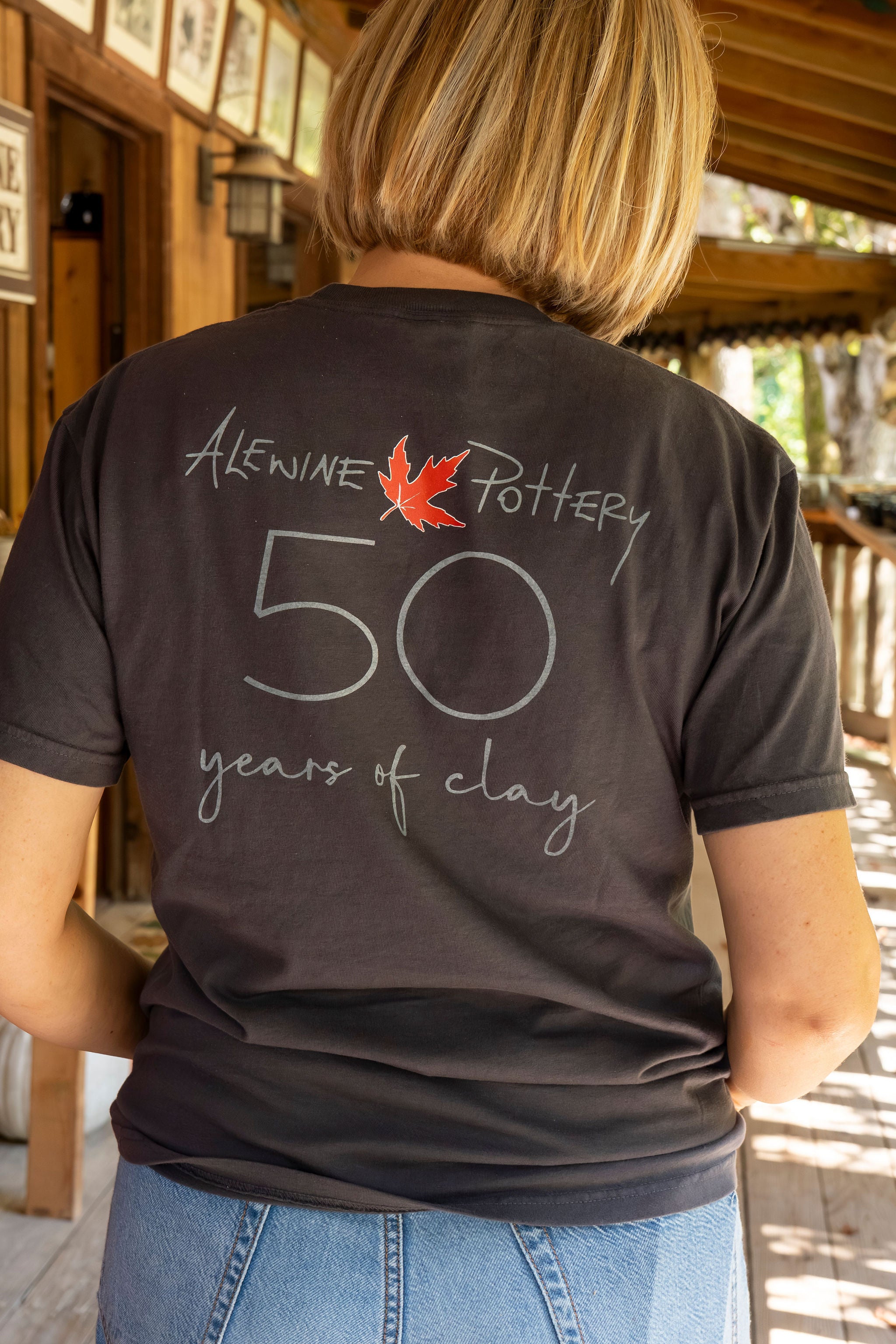 NEW!! Comfort Colors tee shirt to celebrate 50 years of pottery by Robert Alewine! The Alewine Pottery logo is small on the front and our 50 years celebration logo is on the back. Fits true to size.