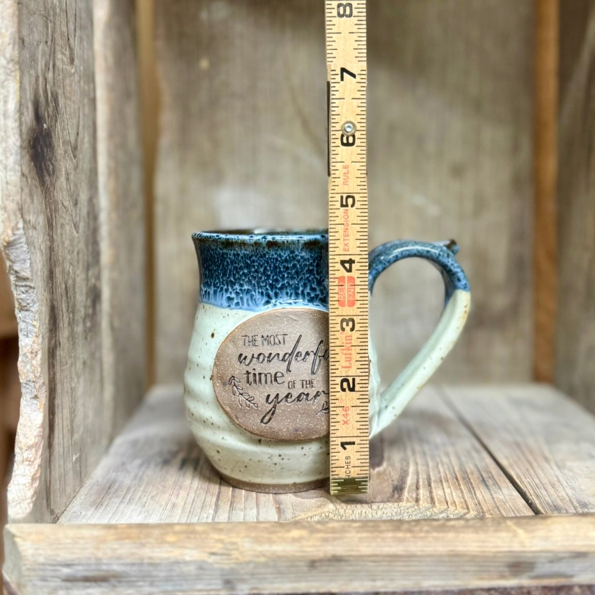 Seasonal mug that holds 14 ounces and is microwave and dishwasher safe.