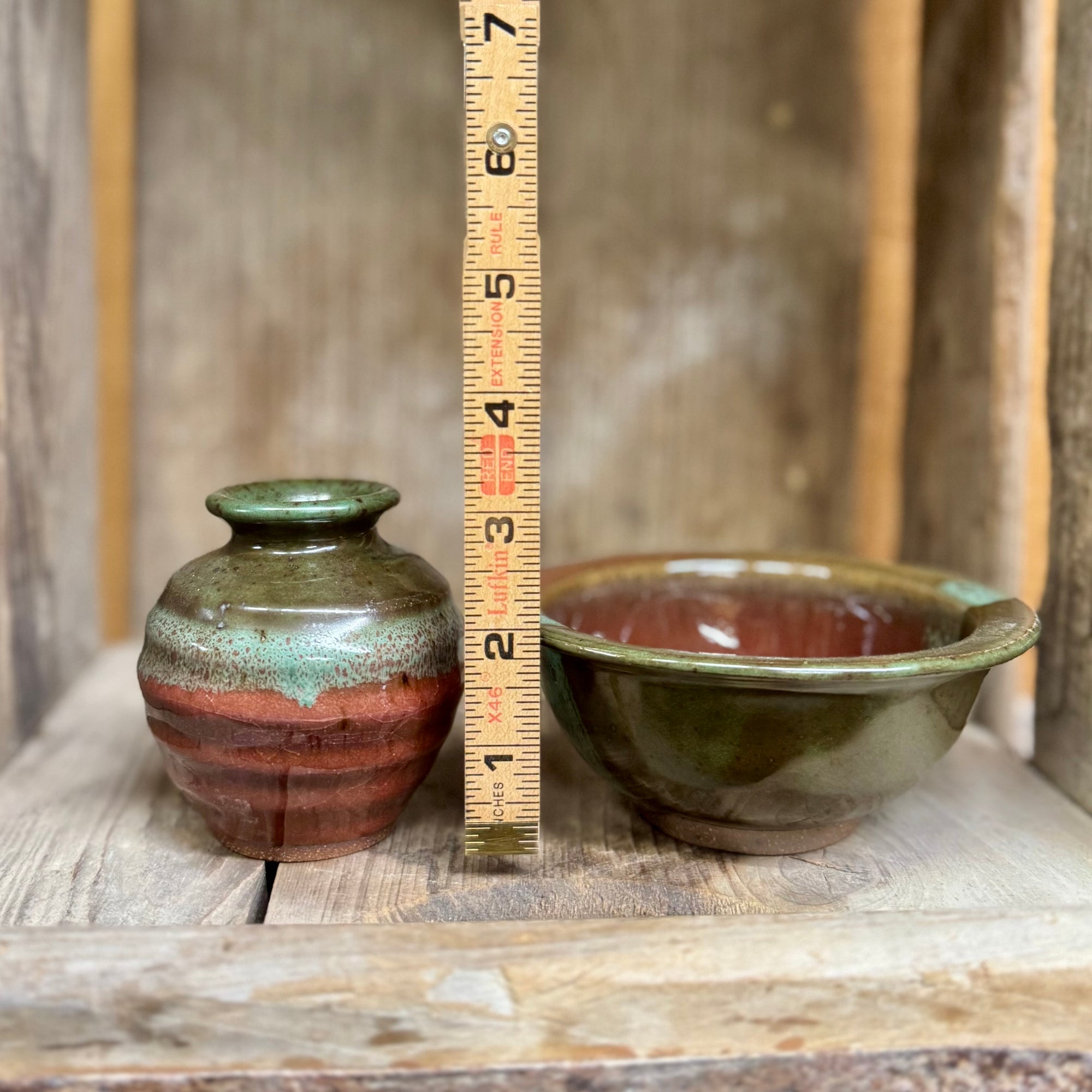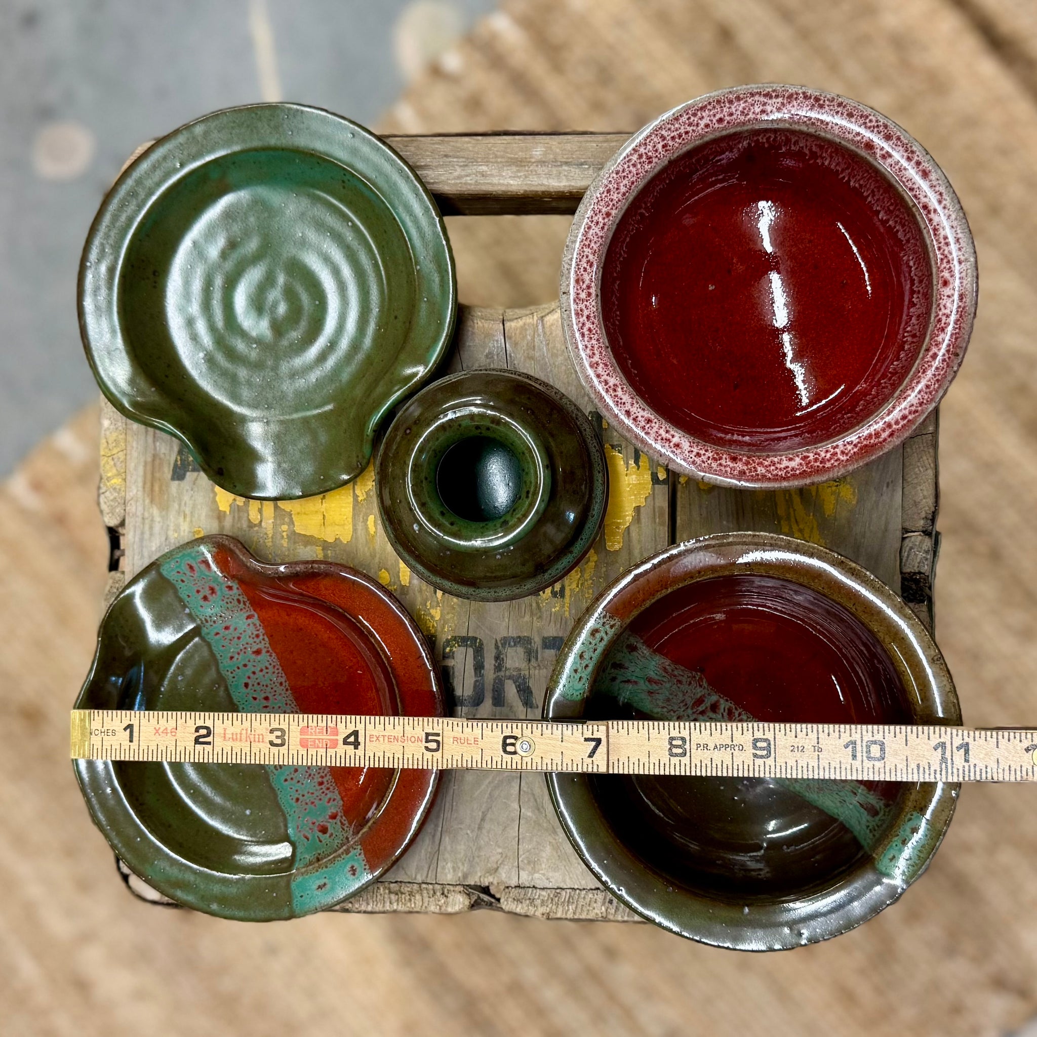 Set of 2 Salsa Bowls and 2 Spoon Rests and 1 Mini Vase in coordinating colors.
