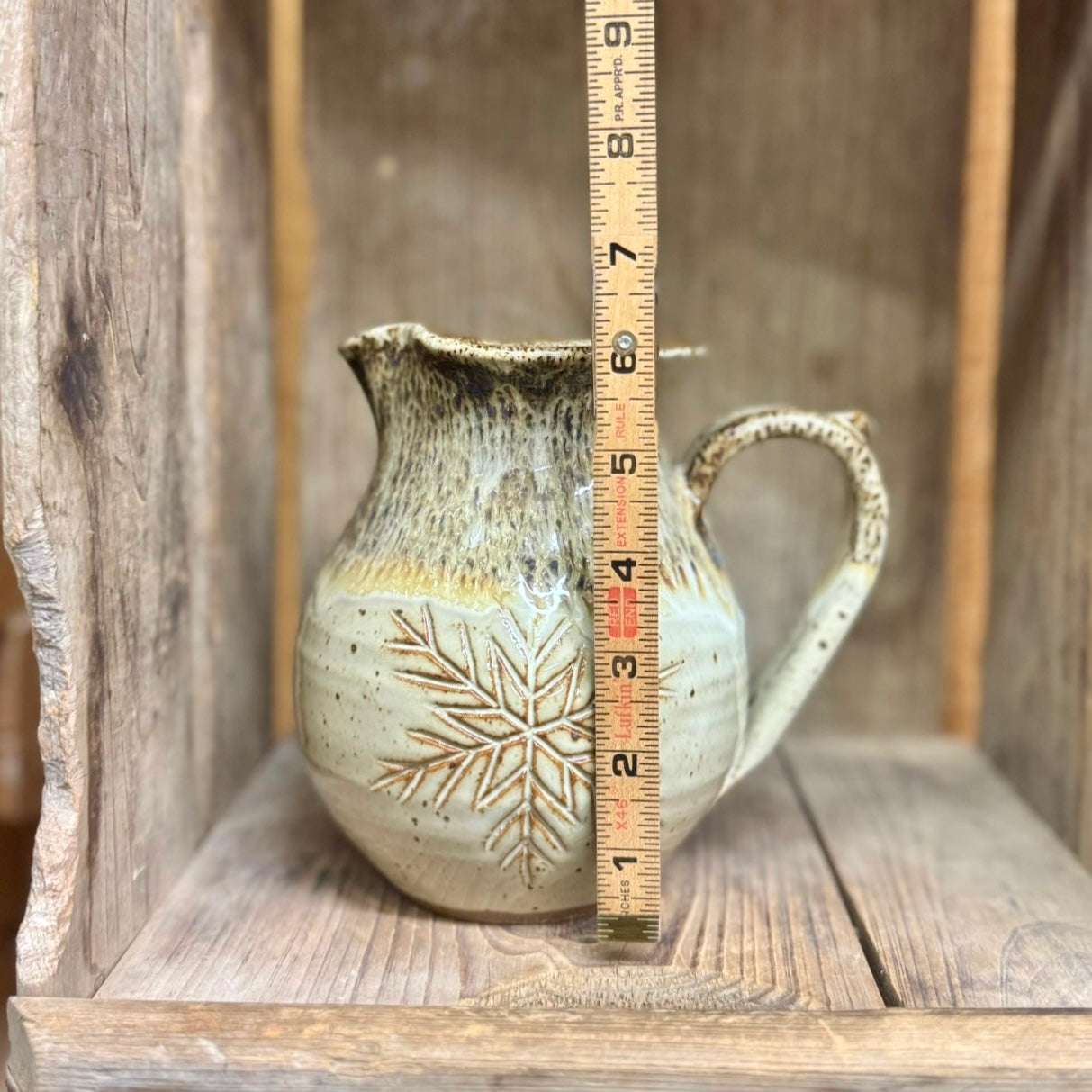 6 cup pitcher with our hand carved snowflake design.