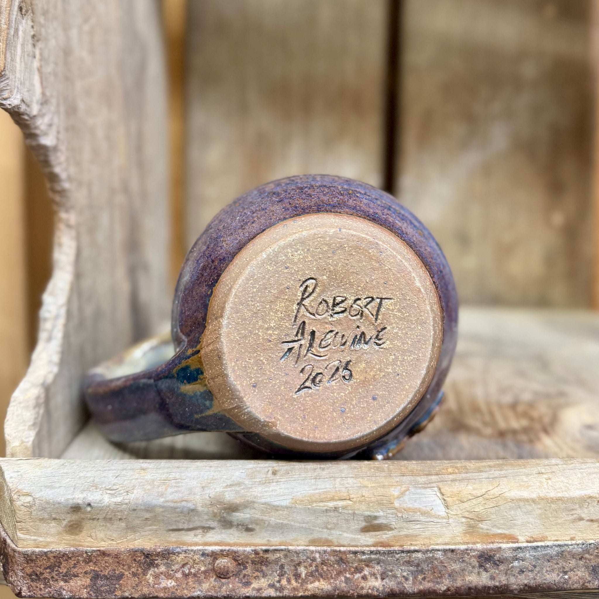 Snowflake medallion mug made and signed by Robert. Holds approximately 12 ounces and is microwave and dishwasher safe.