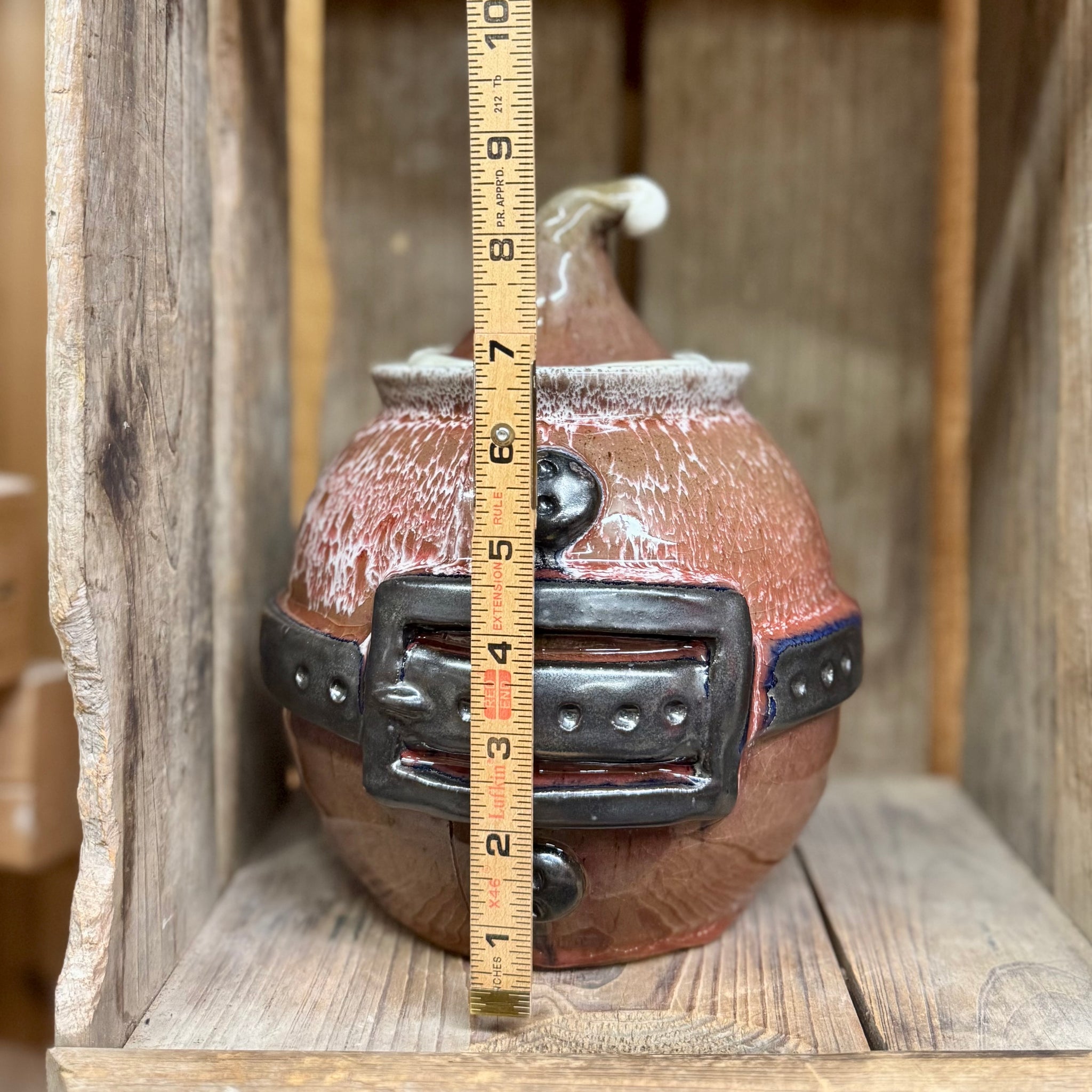Hand built Santa features on this lidded cookie jar! Our red glaze has “crazing” which appear as tiny “cracks” in the glaze. This is just an effect of the glaze and not actual cracks. The red has “burned out” a bit on these and the result is faded red color.