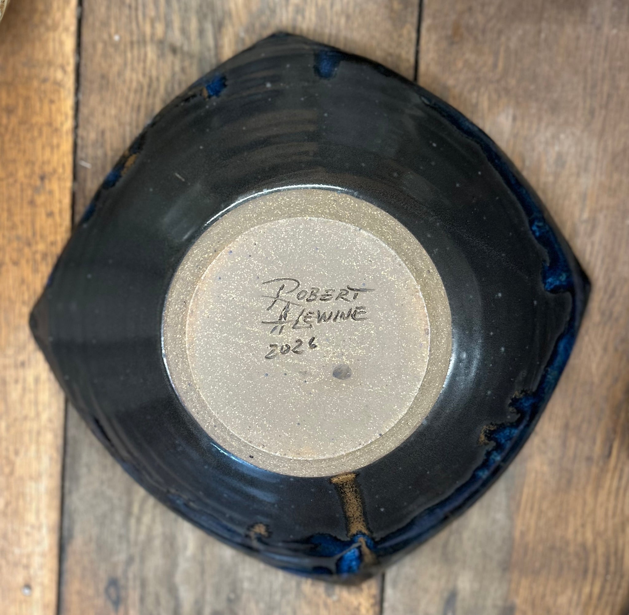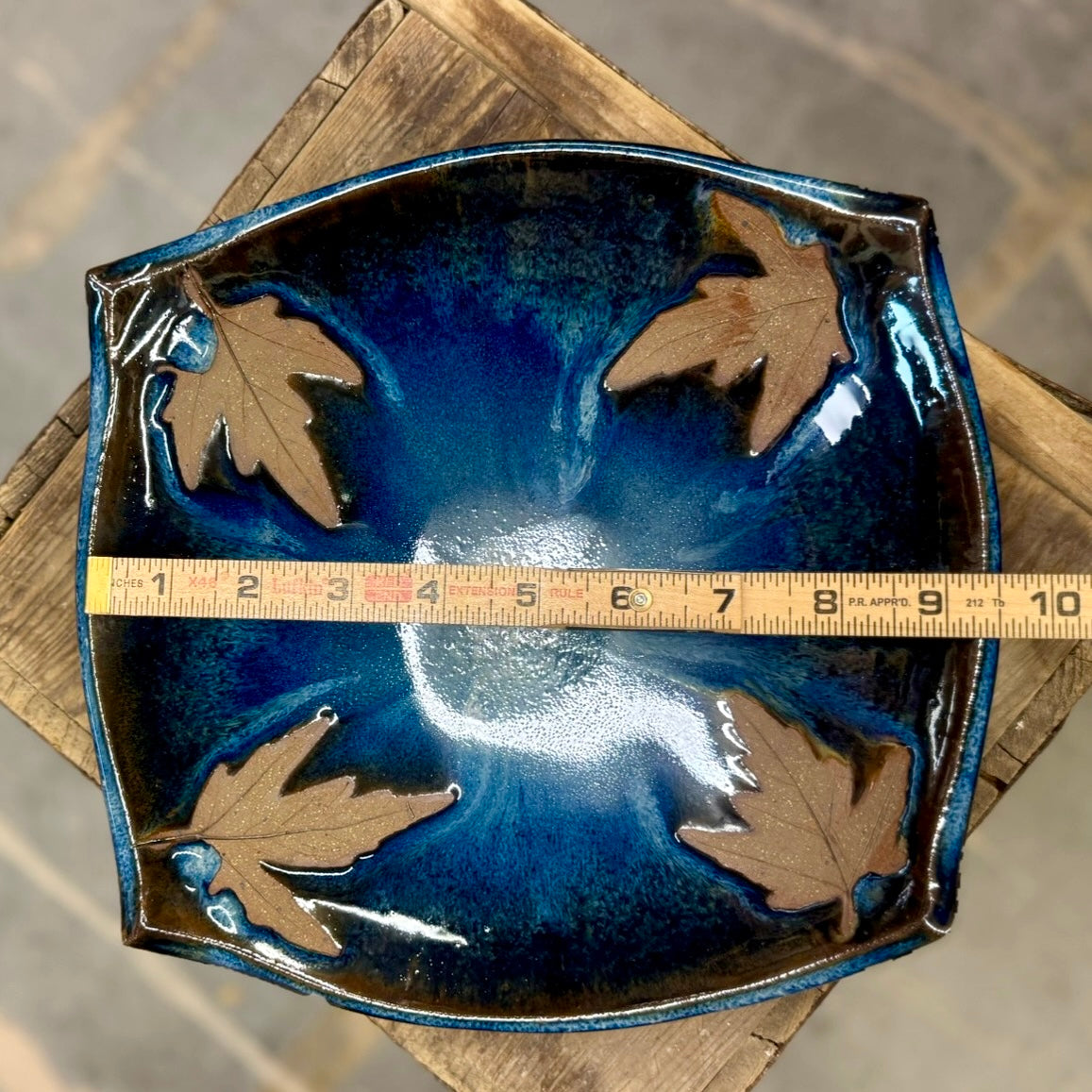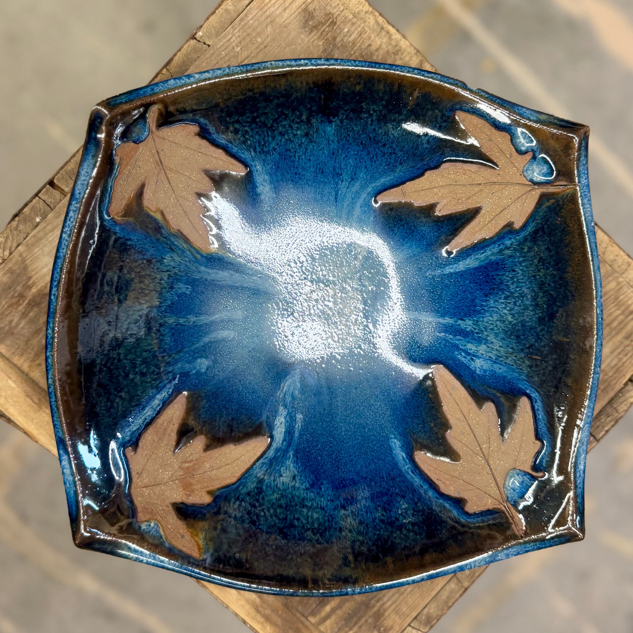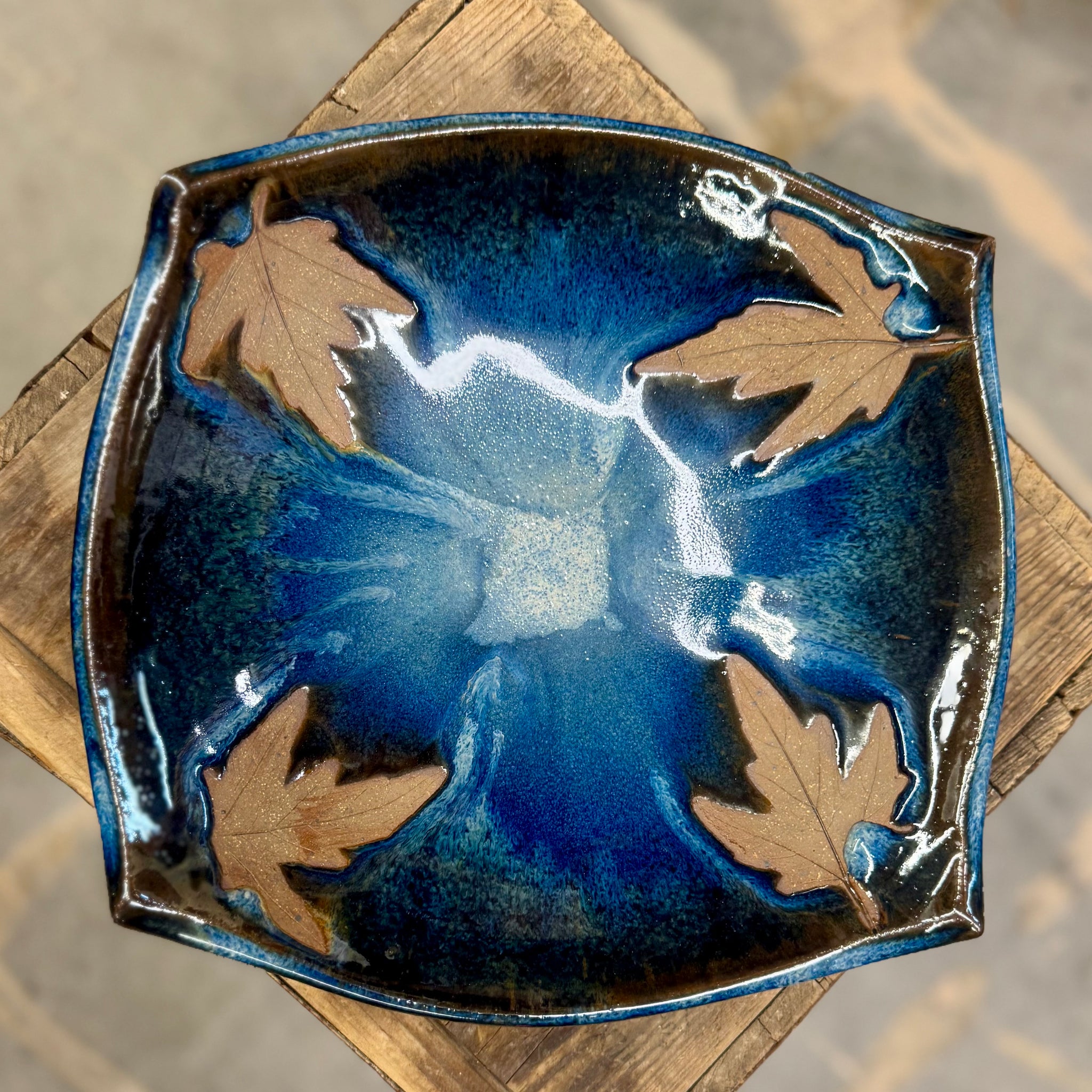 Very shallow bowl with squared sides and real leaf impressions.
